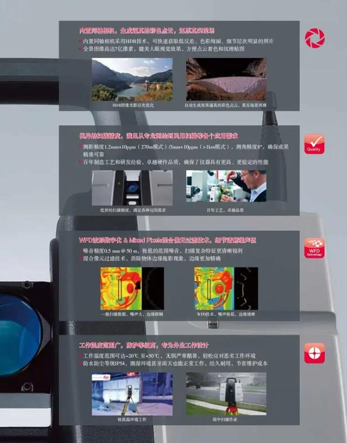 徠卡測(cè)量系統(tǒng)打造的長(zhǎng)測(cè)程三維激光掃描儀ScanStation P50,在繼承高精度的測(cè)角測(cè)距技術(shù)、 WFD波形數(shù)字化技術(shù)、 Mixed Pixels混合像 元技術(shù)和HDR圖像技術(shù)的同時(shí),掃描距離提高至1km以上,使得徠卡ScanStation P50具有更長(zhǎng)的測(cè)程和更強(qiáng)大的性能,滿足長(zhǎng)距離及各種掃描任務(wù)需求。